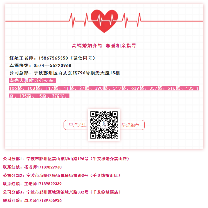 王老师知我懂我也非常支持我的择偶观,在宁波千艾缘相亲之后我对此有了更深的确信。几位约见男士都与我的预期很接近,其中我的现任与我各方面的匹配程度最高,第一次见面我们就对彼此产生了很深的好感。最让我心动的是,优秀如他拥有一双欣赏他人的眼睛,风趣幽默的举动更是让我心态变得年轻起来。“与他在一起我是轻松、愉快的。”我常常会这样告诉王老师。